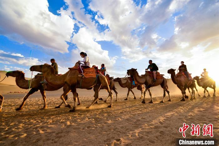 圖為游客騎駱駝觀賞大漠風景。 王斌銀 攝