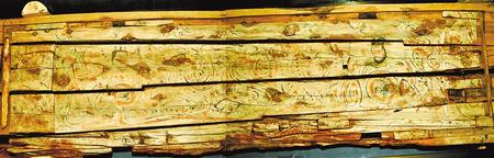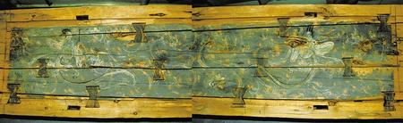 1998年新城魏晉南墓出土。這副完整的木棺由棺身和棺蓋組成,棺蓋內(nèi)側(cè)有一長(zhǎng)方形凹面,內(nèi)彩繪伏羲女?huà)z圖。伏羲女?huà)z人首蛇身,兩尾相交,伏羲在右,左手執(zhí)矩,女?huà)z在左,右手執(zhí)規(guī)。伏羲女?huà)z周?chē)椩茪饧y。棺身呈長(zhǎng)方體,兩檔頭用墨線勾畫(huà)星象圖,棺內(nèi)側(cè)四壁彩繪幃帳、絹帛、蠶繭等圖形。