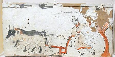 此后,在酒泉丁家閘十六國墓壁畫中就只有一牛牽引的雙轅犁了。說明魏晉時(shí)期是中國從二牛單轅犁過渡到一牛挽拉雙轅犁的時(shí)代,這一過渡的狀況及特點(diǎn)出現(xiàn)在嘉峪關(guān)地主墓葬壁畫中,又說明甘肅是這一重大農(nóng)技改革的地區(qū)之一。
