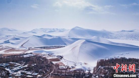 11月20日凌晨,甘肅敦煌降下2021年入冬以來的第一場雪。當日上午10時左右,敦煌大漠雪后天氣放晴,被白雪覆蓋著的大漠山川銀裝素裹顯得分外妖嬈,遠遠望去鳴沙山白雪茫茫,沙雪交融,美景如畫,呈現出難得一見的北方雪國風情。