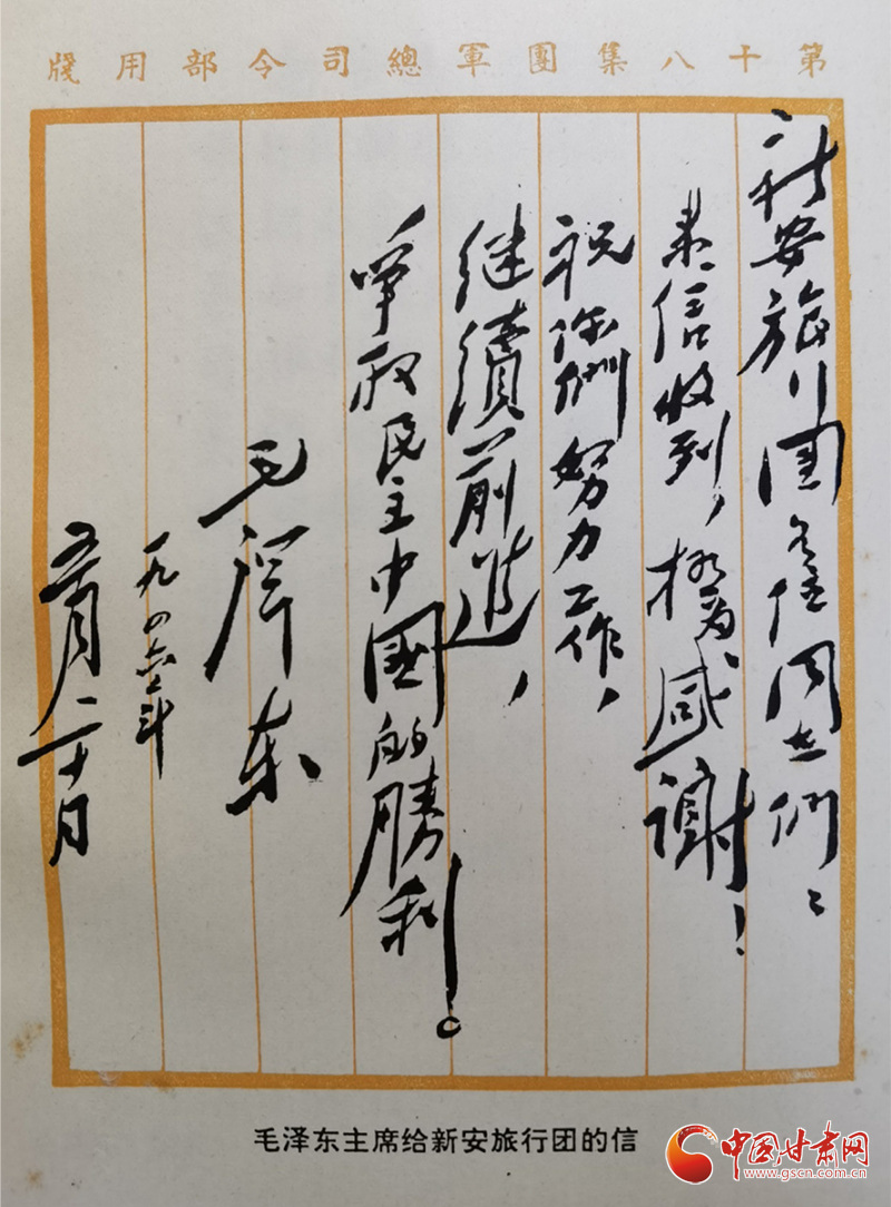 1946年5月20日,毛澤東主席給新旅回信:“新安旅行團(tuán)各位同志們:來信收到,極為感謝!祝你們努力工作,繼續(xù)前進(jìn),爭取民主中國的勝利。”時隔75年后的2021年5月30日,習(xí)近平總書記給新安小學(xué)的少先隊(duì)員們回信:“當(dāng)年,在黨的關(guān)懷和領(lǐng)導(dǎo)下,‘新安旅行團(tuán)’不怕艱苦,足跡遍及大半個中國,以文藝為武器,喚起民眾抗日救亡,宣傳黨的主張,展現(xiàn)了愛國奮進(jìn)的精神風(fēng)貌。希望你們結(jié)合自身成長實(shí)際學(xué)好黨史,以英雄模范人物為榜樣,從小堅(jiān)定聽黨話、跟黨走的決心,刻苦學(xué)習(xí),樹立理想,砥礪品格,增長本領(lǐng),努力實(shí)現(xiàn)德智體美勞全面發(fā)展。”