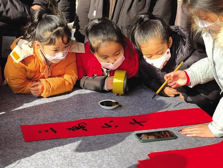 “千門萬戶曈曈日,總把新桃換舊符”。書法老師們提筆蘸墨,行云流水,落筆如云煙,寫成了一副副寓意吉祥美好的春聯(lián)。孩子們懷著一顆顆憧憬之心,圍繞在老師們的周圍,幫忙擺放、晾曬春聯(lián)。最后,孩子們將老師寫好的春聯(lián)送給了爸爸媽媽,以及前來參觀的游客們。