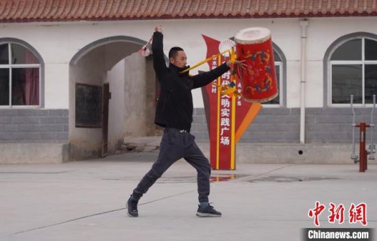 中新網(wǎng)蘭州2月18日電 (徐雪 魏宇嘉)2月中旬,在甘肅蘭州市永登縣苦水鎮(zhèn),33歲鄧鑫擊打起太平鼓,紅色的鼓或被擎于頭頂,或被旋至身后,騰起跨越間,鼓鞭捶打出陣陣鼓聲,頓挫磅礴,具有穿透力。
