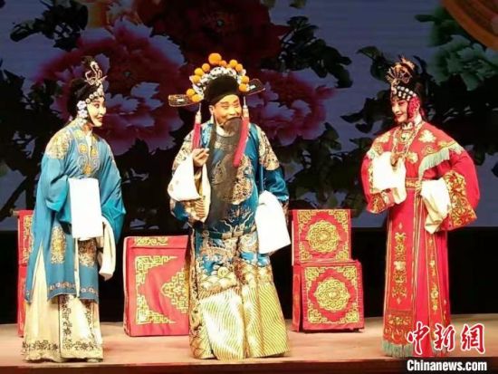 2月中旬,中新網(wǎng)記者采訪甘肅省級非遺傳承人趙希順。圖為趙希順(左二)登臺表演隴劇。 甘肅省隴劇院供圖