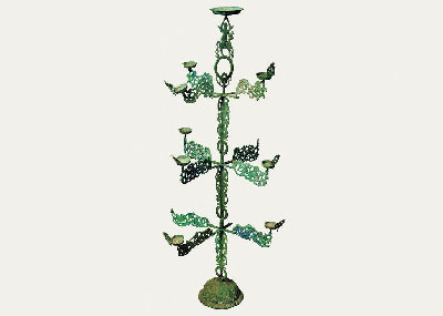 燈座為倒置喇叭形,座面飾瑞獸紋和云氣紋。燈呈樹形,主干分為三段,套插而成,段與段銜接處各置十字形托架,猶如燈樹之分枝。十字托橫向四出,四端各飾透雕花葉一個,象征火焰,干枝頂端有仙人騎鹿形花飾。原有燈13盞,現(xiàn)存9盞。