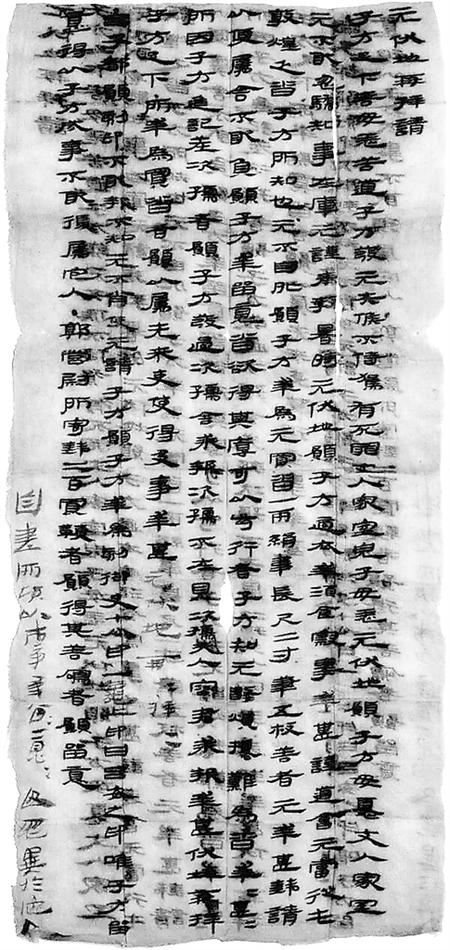 子方足下,善毋恙!苦道子方發(fā),元失候不侍駕,有死罪。丈人、家室、兒子毋恙,元伏地愿子方毋憂。丈人、家室元不敢忽驕,知事在庫,元謹(jǐn)奉教。暑時(shí)元伏地愿子方適衣、幸酒食、察事,幸甚!謹(jǐn)?shù)溃簳?huì)元當(dāng)從屯敦煌,乏沓,子方所知也。元不自外,愿子方幸為元買沓一兩,絹韋,長尺二寸;筆五枚,善者,元幸甚。錢請(qǐng)以便屬舍,不敢負(fù)。愿子方幸留意,沓欲得其厚、可以步行者。子方知元數(shù)煩擾,難為沓。幸甚幸甚!所因子方進(jìn)記差次孺者,愿子方發(fā)過次孺舍,求報(bào)。次孺不在,見次孺夫人容君求報(bào),幸甚,伏地再拜子方足下!所幸為買沓者,愿以屬先來吏,使得及事,幸甚。元伏地再拜再拜!