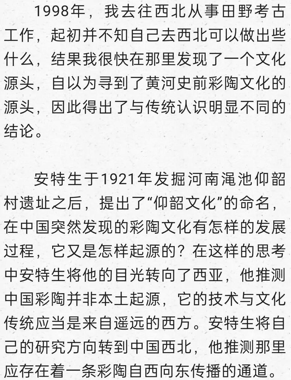 安特生從1923年開始沿黃河西行,去追溯仰韶文化和彩陶文化的源頭。他在甘肅和青海一帶發(fā)現(xiàn)了豐富的古文化遺存,發(fā)現(xiàn)了比中原數(shù)量更多的彩陶,這使得他流連忘返,一直在那里待了近兩個年頭。安特生發(fā)現(xiàn)六種考古學(xué)文化中都見到了彩陶,他認(rèn)為這些考古學(xué)文化處于新石器時代晚期到向青銅時代過渡的時期,絕對年代約在公元前3500年到1500年之間,包括仰韶在內(nèi)它們代表了6個發(fā)展階段,它們是齊家期、仰韶期、馬廠期、辛店期、寺洼期和沙井期,這便是他創(chuàng)建的“六期說”。將齊家期放在仰韶期之前,齊家期簡單而質(zhì)樸的彩陶紋飾,被認(rèn)定是彩陶開始出現(xiàn)的證據(jù)。