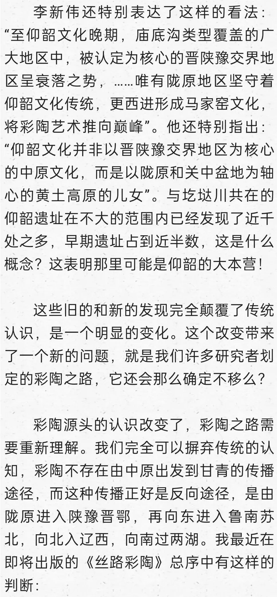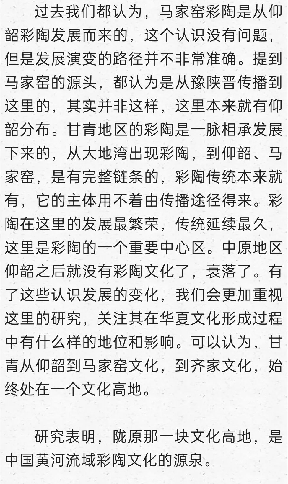 在這里明確提出到甘青尋找仰韶文化的正源,后來我又寫成《秦安大地灣遺址彩陶研究》,討論甘青彩陶的序列,也表達(dá)了類似觀點(diǎn):“甘肅及青海東部地區(qū)在距今6000年前左右,就已經(jīng)是仰韶文化的分布區(qū)域,馬家窯文化彩陶的來源應(yīng)當(dāng)就在這個本土區(qū)域,應(yīng)當(dāng)就是仰韶時期的廟底溝文化。從文化的分布與地層堆積關(guān)系找到了甘肅地區(qū)考古學(xué)文化明確的傳承關(guān)系,由彩陶紋飾演變的考察也能尋找到傳承的脈絡(luò)”。