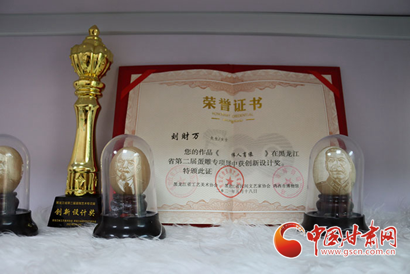 記者在采訪中注意到,社區(qū)的展柜一角擺放著不少獲獎證書,其中一張是在2021年的全國蛋雕專項展上,為劉財萬作品《偉人肖像》頒發(fā)的創(chuàng)新設(shè)計獎證書。“目前正在為全國蛋雕藝術(shù)聯(lián)展作準(zhǔn)備”,當(dāng)記者問起下一步打算時,劉財萬顯得信心十足。