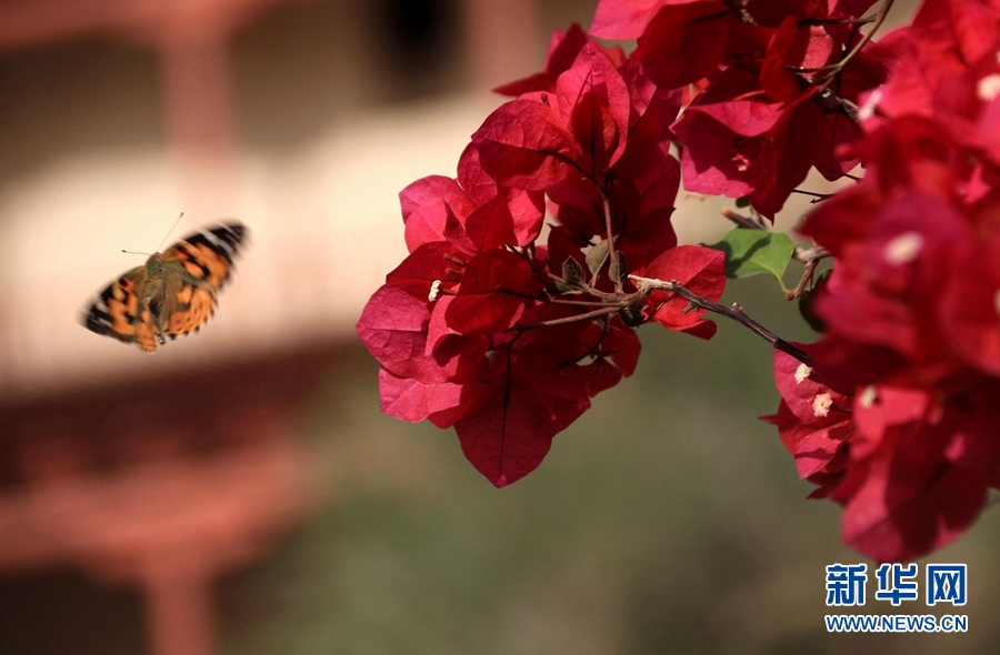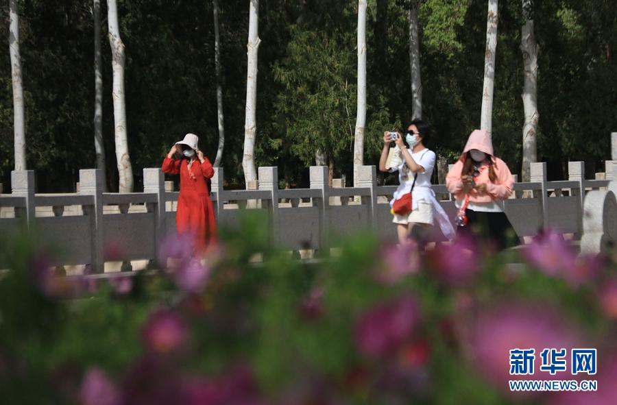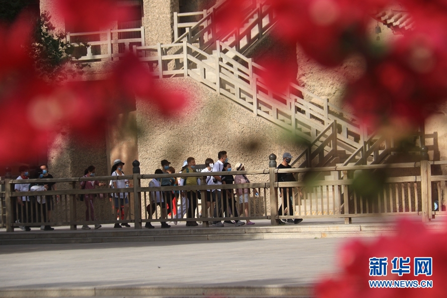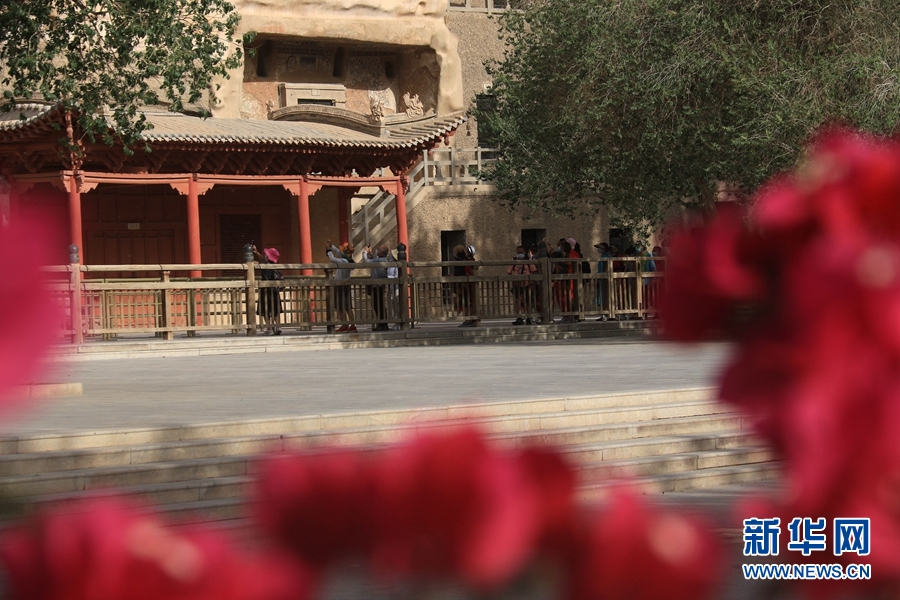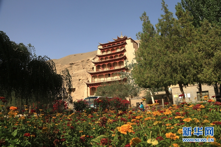 盛夏時節(jié),甘肅省敦煌市莫高窟景區(qū)在三角梅、百日菊等花草的映襯下,顯得分外美麗迷人。