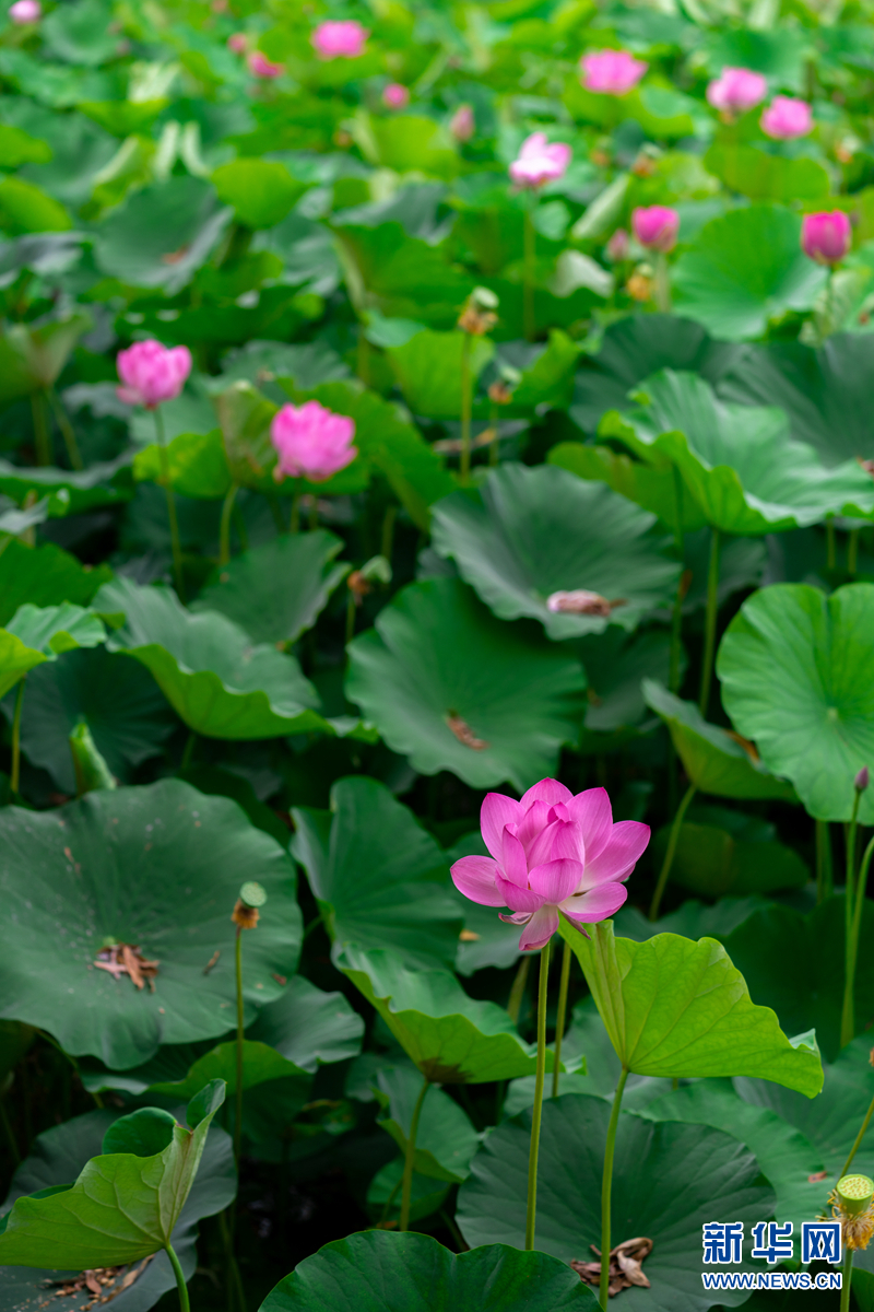 盛夏時節(jié),甘肅省隴南市成縣裴公湖里的荷花競相綻放,在炎炎夏日中帶來一絲清涼。新華網(wǎng)發(fā)(陳爭強 攝)
