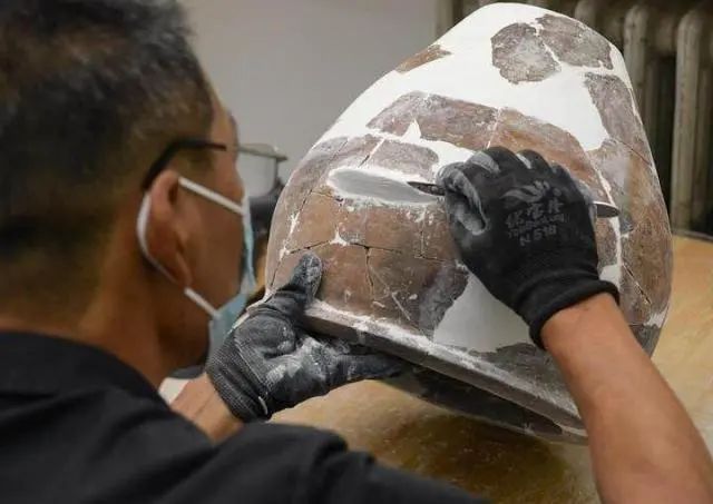 文物工作者對南佐遺址內(nèi)出土的陶器進(jìn)行修復(fù)(8月25日攝)。新華社記者 李賀