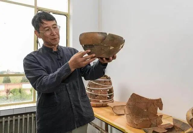 南佐遺址聯(lián)合考古隊領(lǐng)隊、中國人民大學(xué)歷史學(xué)院考古文博系教授韓建業(yè)在遺址研究基地內(nèi)展示出土的陶器(8月23日攝)。新華社記者 李賀 攝