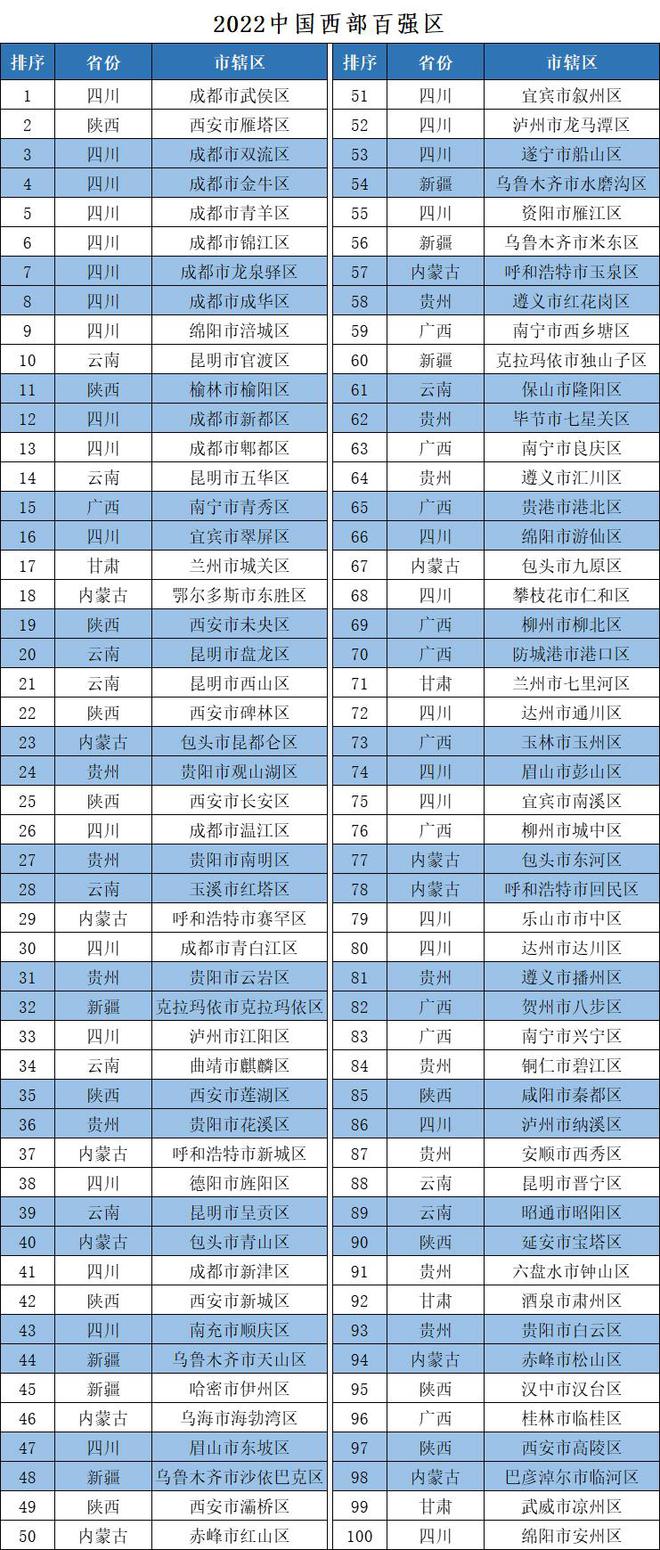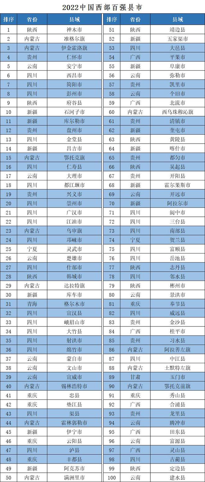 《中國西部地區(qū)縣域發(fā)展監(jiān)測報告》由競爭力智庫、北京中新城市規(guī)劃設(shè)計研究院等機構(gòu)聯(lián)合編制,監(jiān)測評價對象為西部12個?。ㄗ灾螀^(qū)、直轄市)的全部縣域單位,從經(jīng)濟規(guī)模、人民生活、經(jīng)濟活力、發(fā)展質(zhì)量等四個方面進行評價,四個分項指數(shù)合成競爭力指數(shù)。其中,縣(縣級市、自治縣、旗、自治旗、特區(qū))競爭力指數(shù)前100名為“中國西部地區(qū)綜合競爭力百強縣市”,簡稱“中國西部百強縣市”或“西部百強縣”;市轄區(qū)競爭力指數(shù)前100名為“中國西部地區(qū)綜合競爭力百強區(qū)”,簡稱“中國西部百強區(qū)”或“西部百強區(qū)”。今年,課題組在開展西部地區(qū)縣域發(fā)展監(jiān)測評價的基礎(chǔ)上,還聯(lián)合有關(guān)單位和專家,分區(qū)域、分類型總結(jié)了“2022中國西部地區(qū)縣域高質(zhì)量發(fā)展典型案例”,準(zhǔn)格爾旗、平果市、仁壽縣、彭州市、瀘縣、吳起縣、玉門市、開陽縣、大竹縣、彬州市、成都市雙流區(qū)、西安市雁塔區(qū)、昆明市官渡區(qū)、包頭市昆都侖區(qū)、克拉瑪依市克拉瑪依區(qū)、貴陽市觀山湖區(qū)、南寧市青秀區(qū)、蘭州市城關(guān)區(qū)、西寧市城西區(qū)、銀川市興慶區(qū)等20個縣(市、區(qū))入選典型案例名單,供全國交流學(xué)習(xí)。