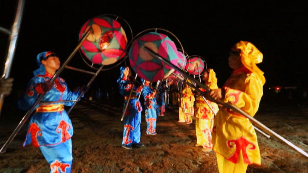 景泰滾燈由燈籠和燈架組成,燈籠分里外兩層,為圓形,外層轉(zhuǎn)動(dòng)內(nèi)層固定,燈籠外層用彩紙或紗綢裱糊。表演者手執(zhí)燈架,輕輕一碰地面,燈籠便轉(zhuǎn)動(dòng)起來(lái)。夜晚,彩燈滾動(dòng),猶若五彩斑斕的長(zhǎng)龍,扭曲躍動(dòng),時(shí)慢時(shí)快,回頭擺尾往復(fù)盤旋,交響輝映,別有一番情趣。