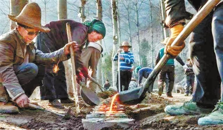形狀神似燕尾的鏵,并非是由工匠在傳統(tǒng)的鐵匠鋪里鍛打而成,要知道,雍壩人的犁鏵生產(chǎn)場地頗具規(guī)模——村頭江邊的空地變成了一個(gè)偌大的生產(chǎn)車間,幾百人集體出動(dòng)、密切協(xié)作,機(jī)器轟鳴,爐火升騰,進(jìn)料的、揚(yáng)爐的、撥碴的、取火的、出鏵的……男女老少齊上陣,吃飯喝水在工地,這樣熱鬧而忙碌的勞動(dòng)場景頗為壯觀。