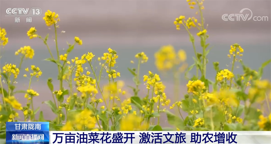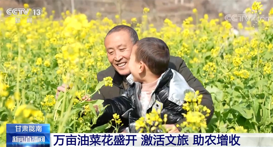 總臺(tái)記者 項(xiàng)思:這里是甘肅省隴南市文縣,位于甘肅的最南端,也是甘肅最早迎來春天的地方。一江碧水、兩岸青山,大面積盛開的油菜花迎著和煦的春風(fēng)泛起金色的波浪,一股濃烈的春天氣息撲面而來。從春節(jié)前10天左右,這里的萬畝油菜花就陸續(xù)開放了。如今步入春天,油菜花已進(jìn)入盛花期。文縣接壤四川,嘉陵江的上游白龍江穿越境內(nèi),氣候溫暖潮濕,具有夏無酷暑、冬無嚴(yán)寒的氣候特點(diǎn),被稱為“隴上江南”。