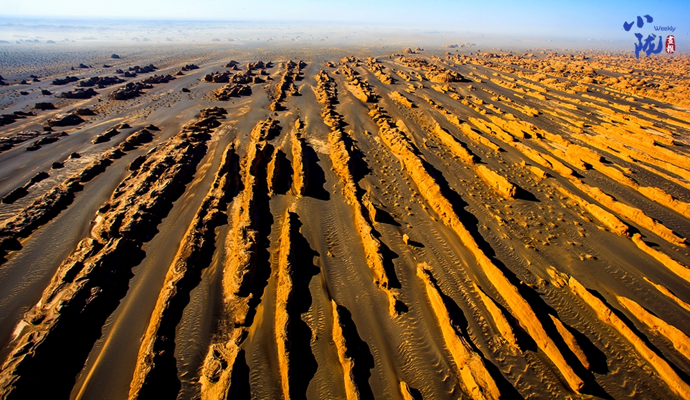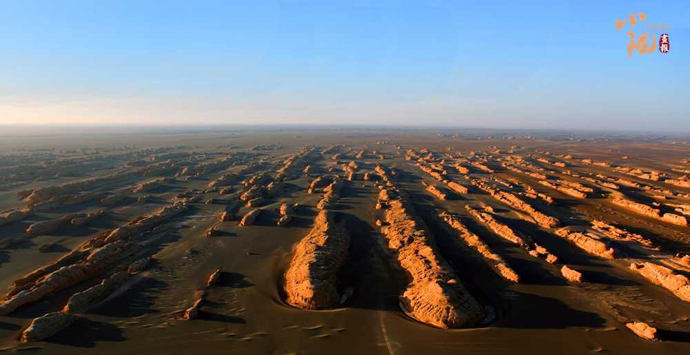 一隊(duì)隊(duì)整齊排列的雅丹像是整裝待發(fā)、氣勢磅礴的遠(yuǎn)航艦隊(duì),在浩瀚無垠的漠海上劈波斬浪,蔚為壯觀,實(shí)屬罕見。