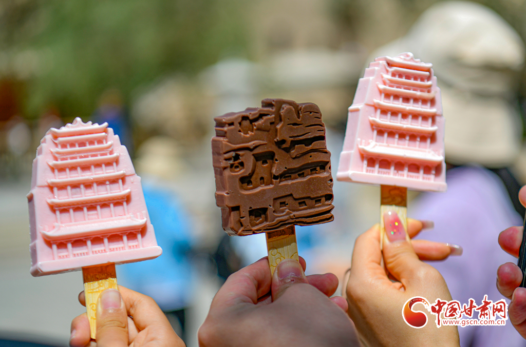 游客手拿莫高窟和九層樓文創(chuàng)雪糕,在莫高窟景點(diǎn)拍照打卡。
