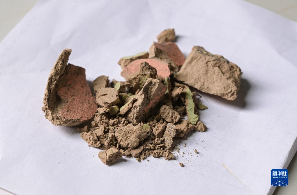 在秦始皇帝陵博物院文物保護部彩色陶俑修復室內的工作臺上擺放著發(fā)掘出土的土塊,這些剝落的彩色土塊正等待修復人員采用精湛的技術復原(8月23日攝)。