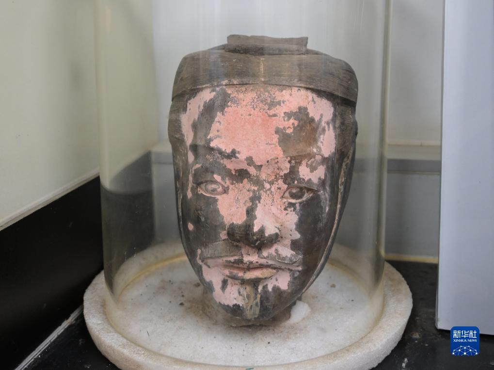 在秦始皇帝陵博物院文物保護部彩色陶俑修復室內,一尊秦俑臉部尚存部分彩繪層。秦俑五官的精準塑造顯示出秦代匠人具有高超的寫實能力(8月23日攝)。
