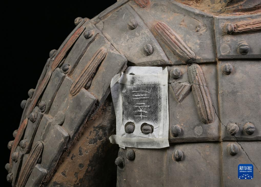 在秦始皇帝陵博物院文物保護部彩色陶俑修復室內,修復人員使用墨拓技術在一尊秦俑的胸前甲片上還原出“三辛”字樣的刻痕。據(jù)介紹,這應是制作該秦俑的秦代工匠名(8月23日攝)。