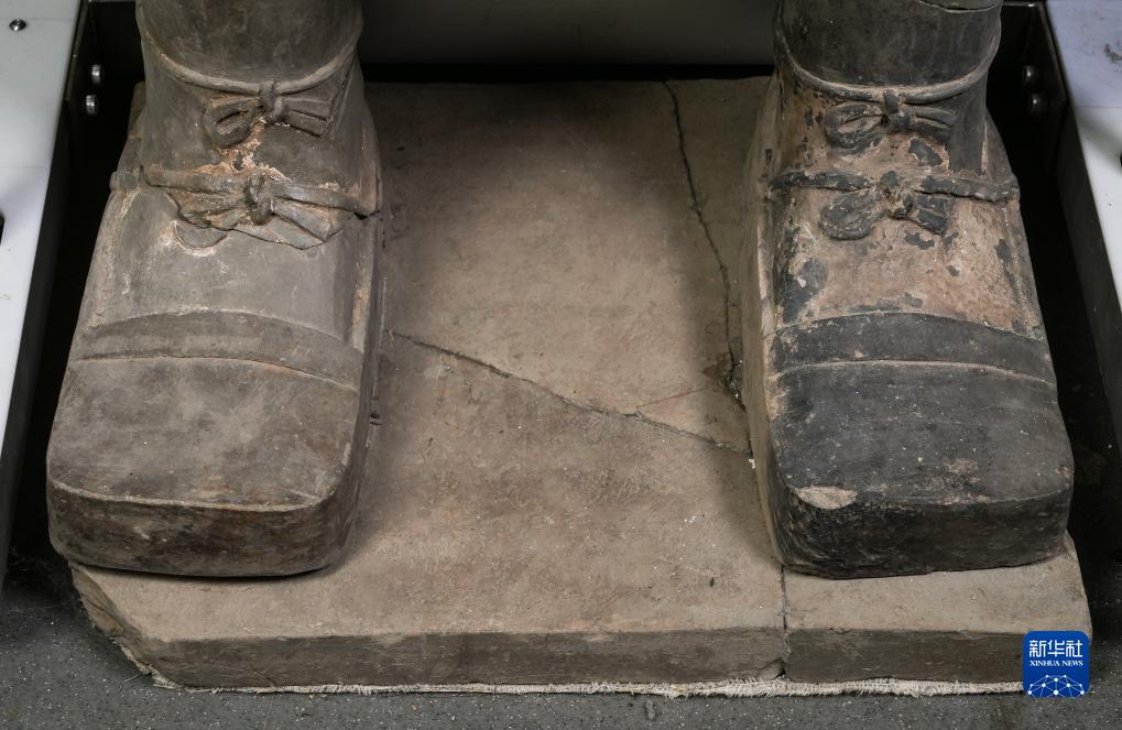 在秦始皇帝陵博物院文物保護部彩色陶俑修復室內,一尊秦俑的雙腳被工匠塑造出細節(jié)(8月23日攝)。