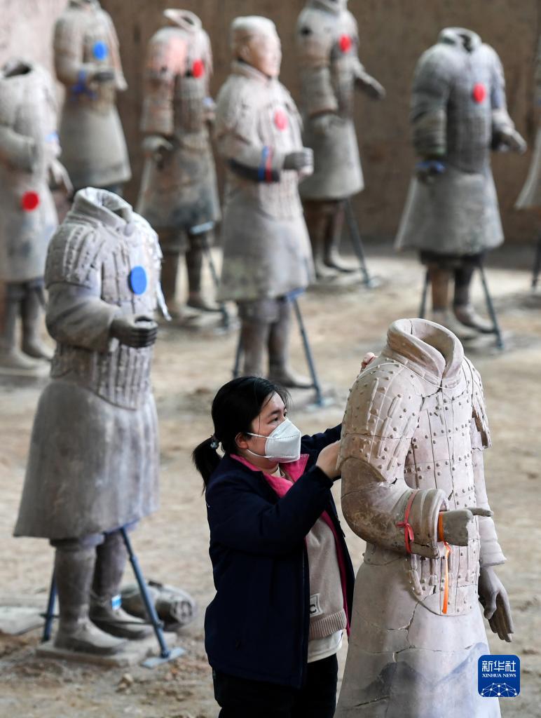 工作人員在秦兵馬俑一號坑遺址進行秦俑修復(4月26日攝)。