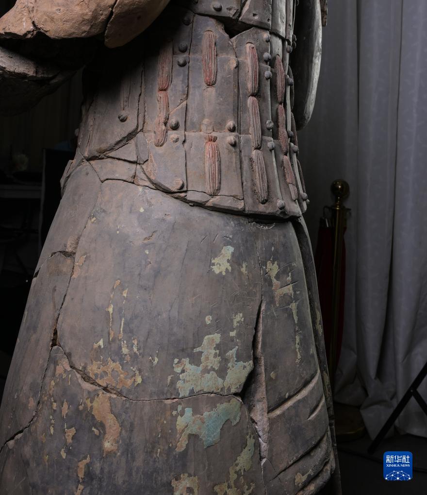 在秦始皇帝陵博物院文物保護部彩色陶俑修復室內,一尊秦俑身后裙裾部的彩繪顏料層依稀可辨(8月23日攝)。