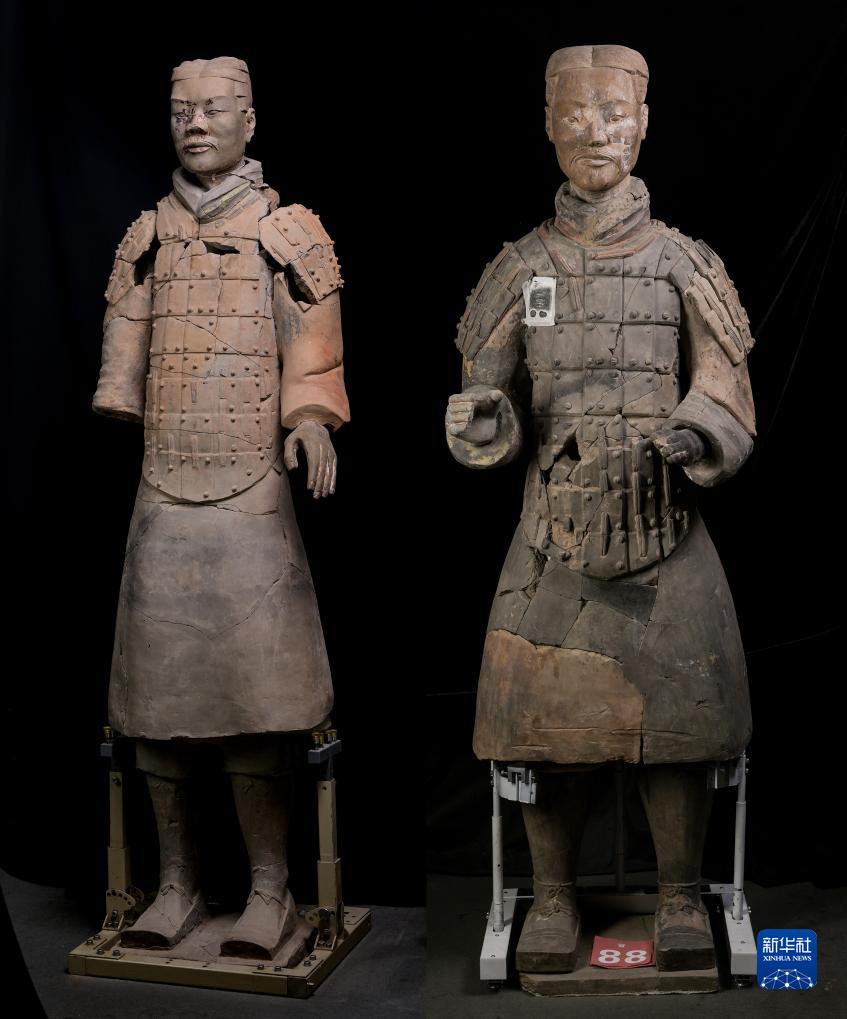 兩尊經(jīng)過修復的彩色秦俑佇立在秦始皇帝陵博物院文物保護部彩色陶俑修復室內(拼版照片,8月23日攝)。