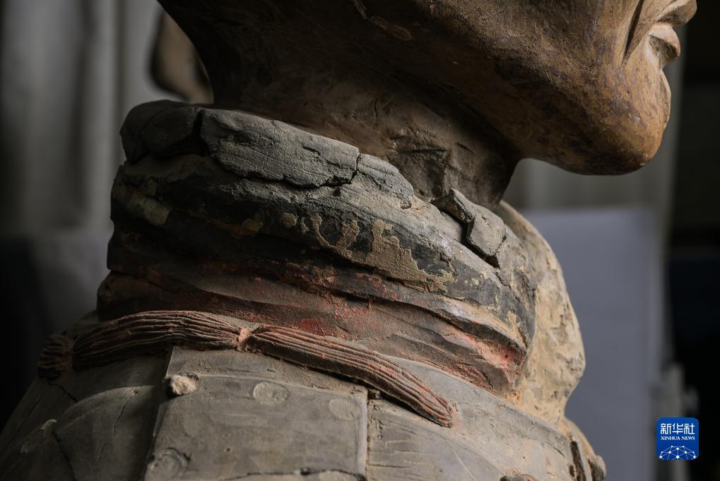 在秦始皇帝陵博物院文物保護部彩色陶俑修復室內,一尊秦俑衣領處的彩繪顏料層依稀可辨(8月23日攝)。
