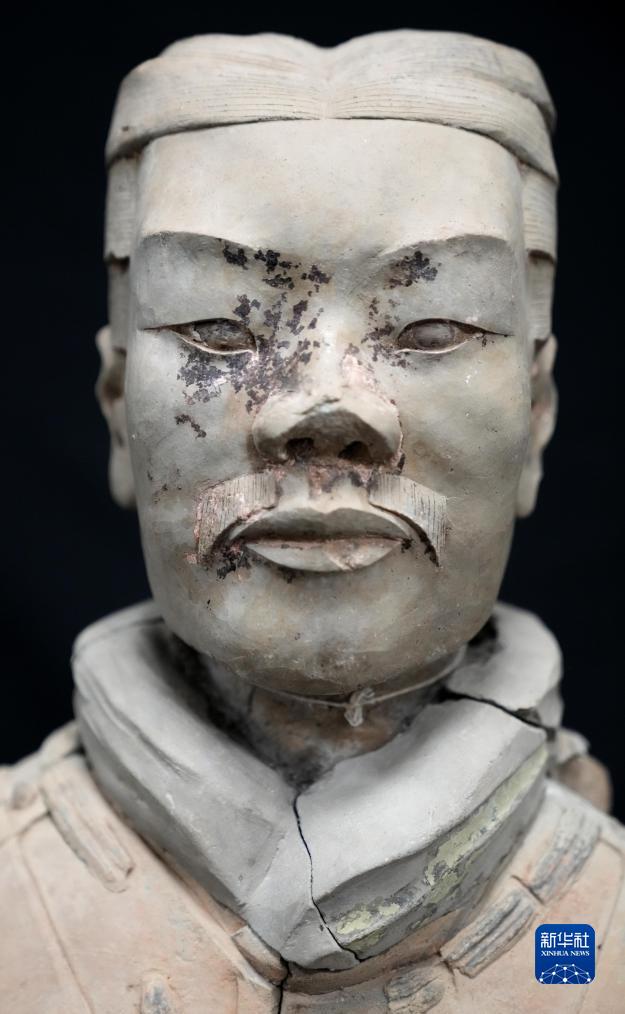 這是秦俑臉部和衣領上的彩繪還原修復后的樣貌(8月23日攝)。