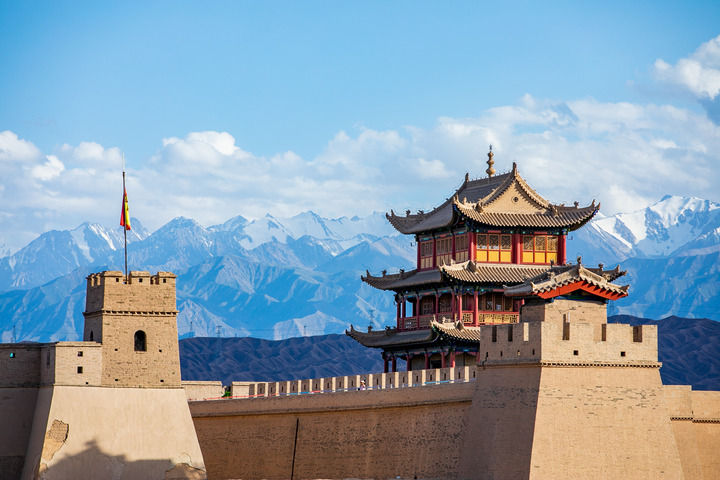 這是2023年7月19日拍攝的祁連雪山與嘉峪關(guān)關(guān)城。 新華社每日電訊記者 朗兵兵 攝