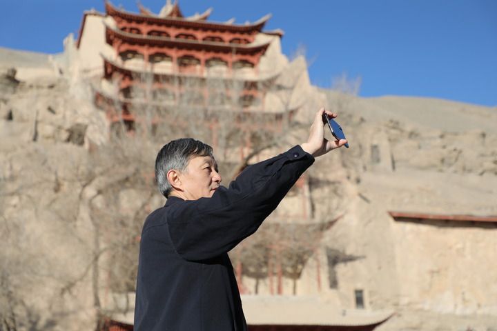 2022年2月23日,敦煌研究院院長蘇伯民正在用手機進(jìn)行“數(shù)字敦煌”體驗。 新華每日電訊記者 張睿 攝