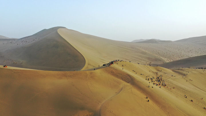 2023年9月11日,游客在甘肅省敦煌市鳴沙山月牙泉景區(qū)游覽。新華社發(fā)(張曉亮 攝)