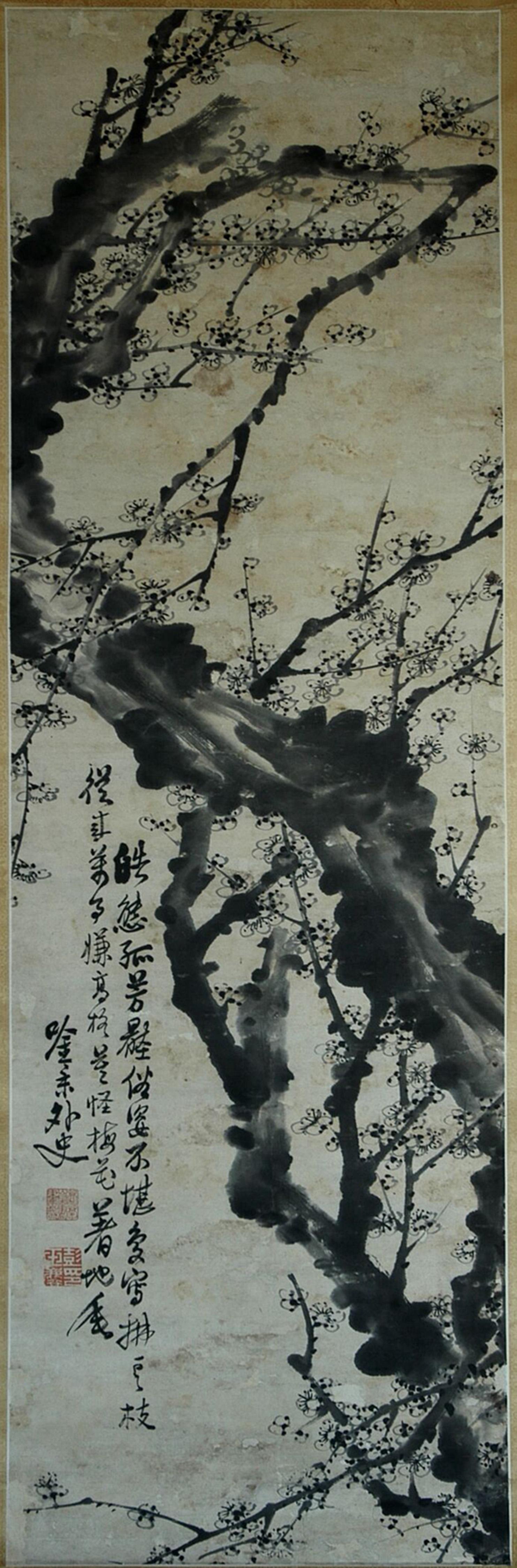 彭玉麟一生所作梅花不下萬(wàn)幅,清水縣博物館館藏的這幅梅花圖屬館內(nèi)舊藏,其來(lái)歷已無(wú)從考證。這幅立軸梅花圖長(zhǎng)133厘米,寬42厘米。畫(huà)面上,一棵下不見(jiàn)根底的老梅,蜿蜒盤(pán)旋凌空而上,好似神龍擺尾,顯得古拙蒼勁,點(diǎn)點(diǎn)梅花用寫(xiě)意筆法一揮而就。畫(huà)作不著顏色,老干繁枝,遒勁如鐵,寒梅點(diǎn)點(diǎn),暗香浮動(dòng),散發(fā)著濃厚的文人畫(huà)氣息。