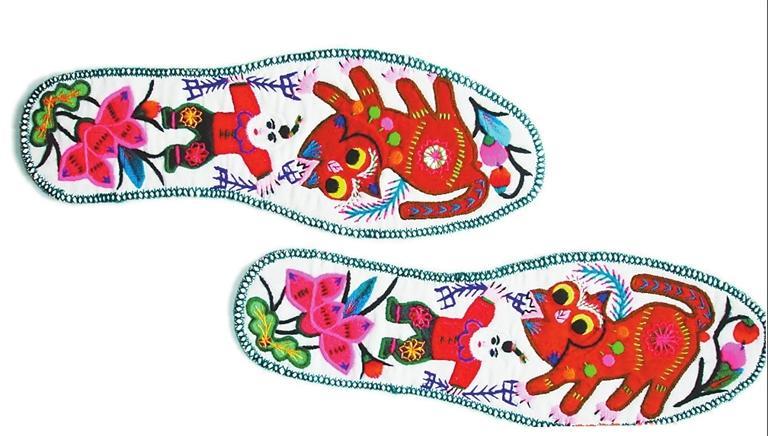北方黃土高原,陜甘寧晉一帶,采用這種藝術縫制刺繡的衣物飾品有拼布藝術的鮮明特征,具有浮雕效果。其具體做法是將貼填繡畫相結合,有人叫做拼貼浮雕繡,在肚兜、枕頂?shù)鹊闹谱髦羞@種技藝采用最多。因為多是整體設計,分部件制作,然后組合成一個完整的畫面在布上,所以叫“逗”,“逗”是秦隴方言,就是手指把不同部件小心拼合在一起組成圖案的動作,因為布片小,要小心仔細,輕輕拼合,所以會“逗裹兜”“逗夾襖”的媳婦,就是心靈手巧的人,說一個女性會“逗”,就是對她的女紅技藝的認可。