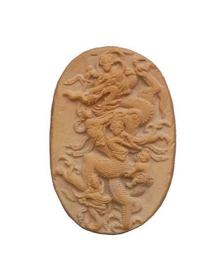 1990年出土于莊浪縣水洛鎮(zhèn)寺坪塬遺址。高11.7厘米,寬7.9厘米,厚1.5厘米,呈橢圓形。泥質(zhì)紅陶,背面平素。畫面表現(xiàn)的是某神話故事,正面飾淺浮雕紋飾,正中為一巨龍張牙舞爪、怒目圓睜、奮力騰空,一女神左手緊抓龍角,右手持劍欲砍龍首;龍頸部有一女神拿繩索套縛,另一女神在龍胸部作拔劍狀;一力士則用力拽龍尾,凸目張嘴,聲色驚恐萬(wàn)分;在龍的后肢旁還有一女神右手握劍砍殺。五神皆神態(tài)各異,造型逼真,生動(dòng)表現(xiàn)了五神伏龍時(shí)驚心動(dòng)魄的場(chǎng)景。