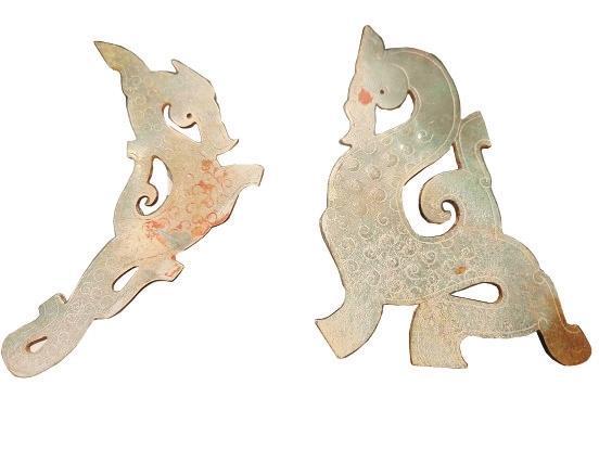 這對(duì)戰(zhàn)國(guó)谷紋玉龍,一個(gè)完整,一個(gè)略有殘缺。春秋戰(zhàn)國(guó)的龍,龍身很長(zhǎng),蜿蜒曲折,一般成對(duì)出現(xiàn)。龍身的裝飾,以谷紋或勾云紋為主,造型較多見的有蟠龍、行龍、虬龍、夔龍。戰(zhàn)國(guó)的龍身形態(tài)各異,基本上有個(gè)共同特點(diǎn)—“水滴眼”,龍頭多為“連云頭”,廓線出鋒,棱角分明。裝飾上多為陰刻和浮雕工藝。