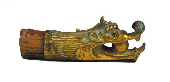 肅南裕固族自治縣馬蹄鄉(xiāng)二夾皮村出土。長(zhǎng)19.3厘米,銅質(zhì),鎏金。形狀為龍頭,頸部中空,龍頭部分為獨(dú)角,龍眼暴睜,上唇卷起,口內(nèi)含有一圓球。頸部龍發(fā)呈條形狀。