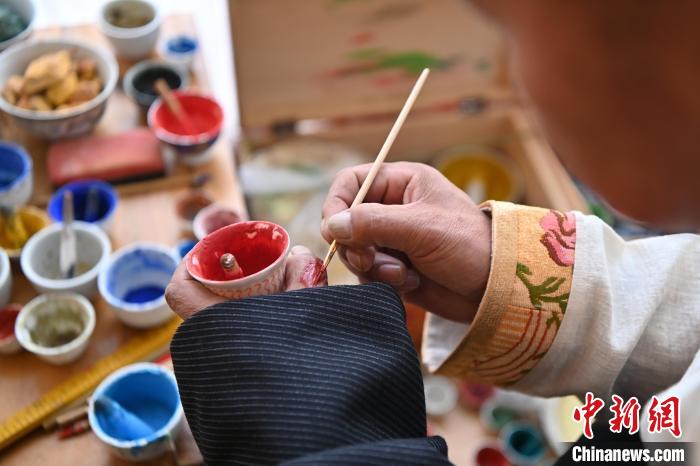 圖為交巴加布在其工作室內給唐卡上色。他擅長運用細膩的筆觸和豐富的色彩,將人物形象刻畫得栩栩如生,生動逼真。每一幅唐卡都仿佛是一個故事,充滿了生命力和情感。九美旦增 攝