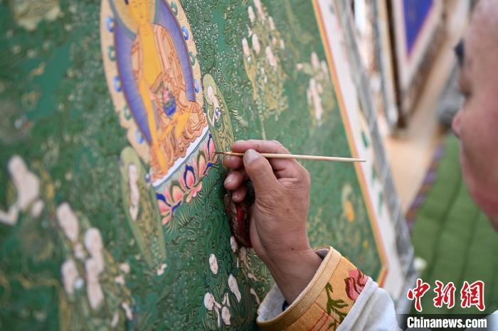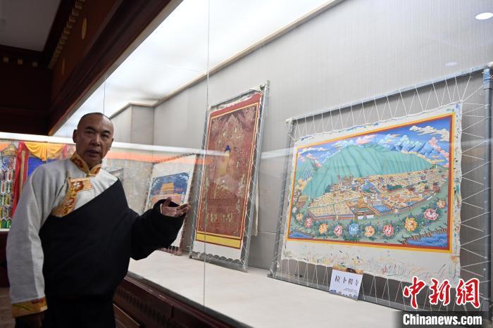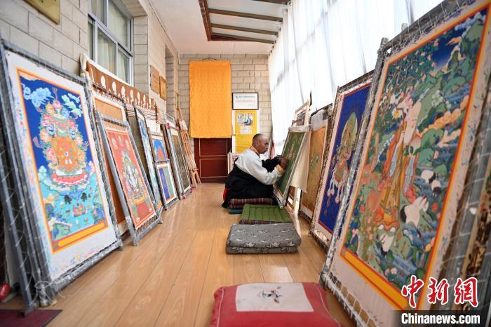 圖為交巴加布展示以拉卜楞寺為主題的唐卡作品。交巴加布不僅繼承了傳統(tǒng)唐卡技藝,更在創(chuàng)新中展現(xiàn)了個人特色。他結合現(xiàn)代審美和繪畫技巧,使作品既保留了傳統(tǒng)的韻味,又具有鮮明的現(xiàn)代氣息。這種獨特的藝術風格使他的作品在眾多唐卡中脫穎而出,成為藏族民眾和藝術愛好者爭相收藏的藝術珍品。九美旦增 攝