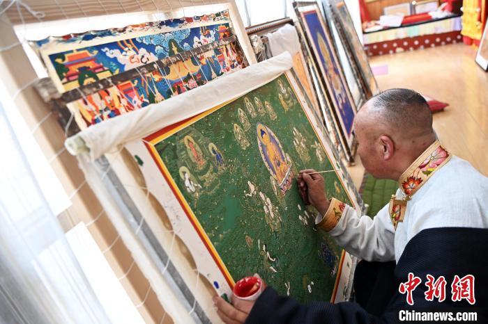 圖為交巴加布在個人工作室內給唐卡上色。一幅精美的唐卡作品,需要耗費畫師幾個月甚至幾年時間。從勾線到著色,每一步、每一筆都要屏息凝神。九美旦增 攝