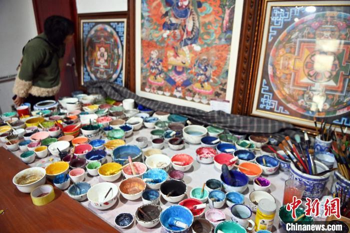 圖為唐卡小鎮(zhèn)一畫室內擺出大大小小已完成的唐卡和各色顏料。唐卡具有鮮明的民族特點和獨特的藝術風格,采用金、銀、珍珠、瑪瑙、珊瑚、松石、孔雀石、朱砂等珍貴的礦物寶石和藏紅花、大黃、藍靛等植物為顏料。九美旦增 攝