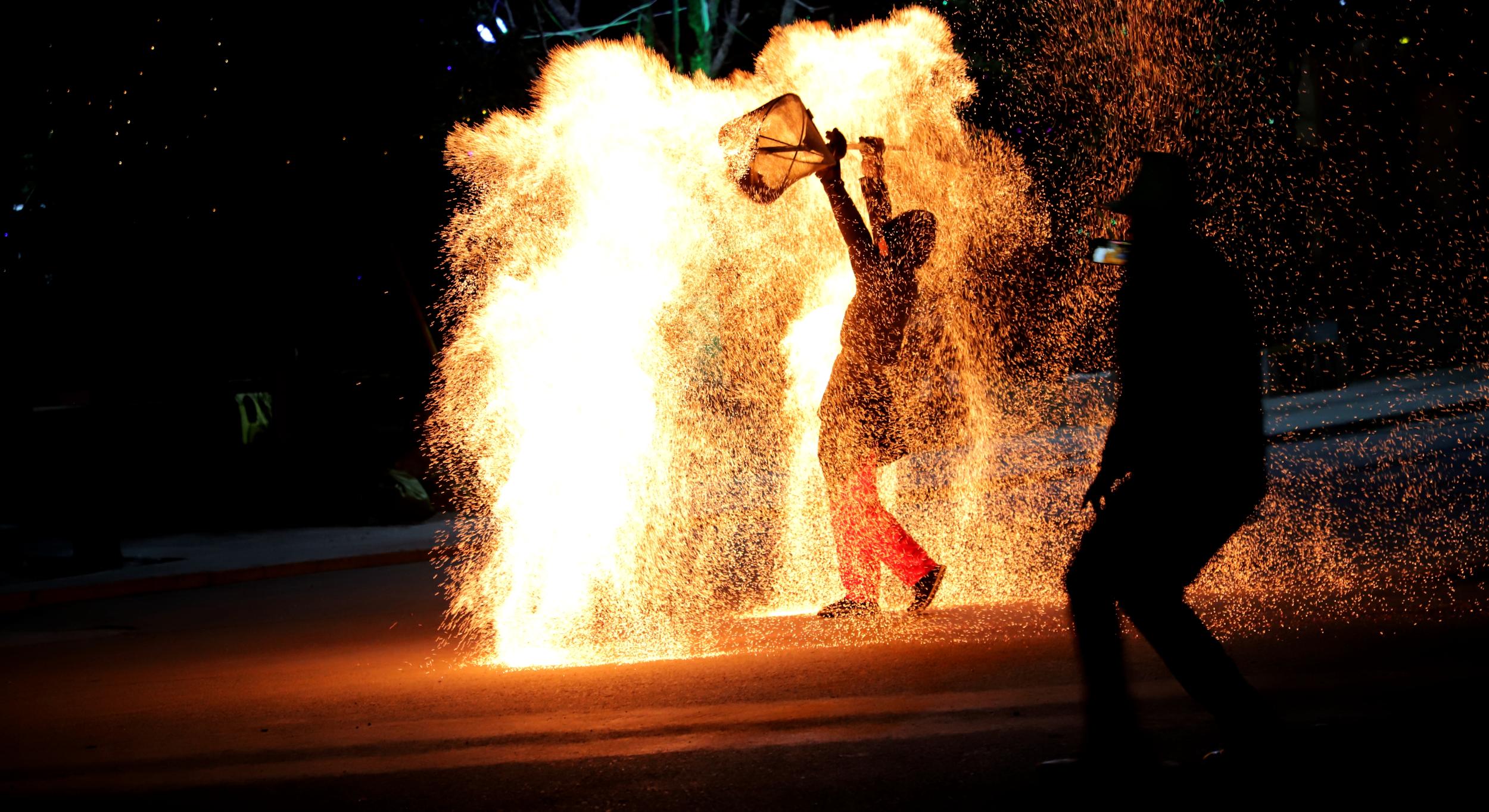 活動(dòng)現(xiàn)場(chǎng),鐵花飛濺,流星如瀑?,F(xiàn)場(chǎng)火樹銀花璀璨奪目,絢爛的鐵花在空中綻放,令人驚艷。專業(yè)打花人將近1500多攝氏度的高溫鐵汁用力擊打,化為火樹銀花,在空中形成鐵花,四處飛濺,放眼望去,一串串耀眼的鐵花在空中散開,猶如煙花綻放,又似流星滑落,繪就“鐵樹銀花落,萬(wàn)點(diǎn)星辰開”的美景。