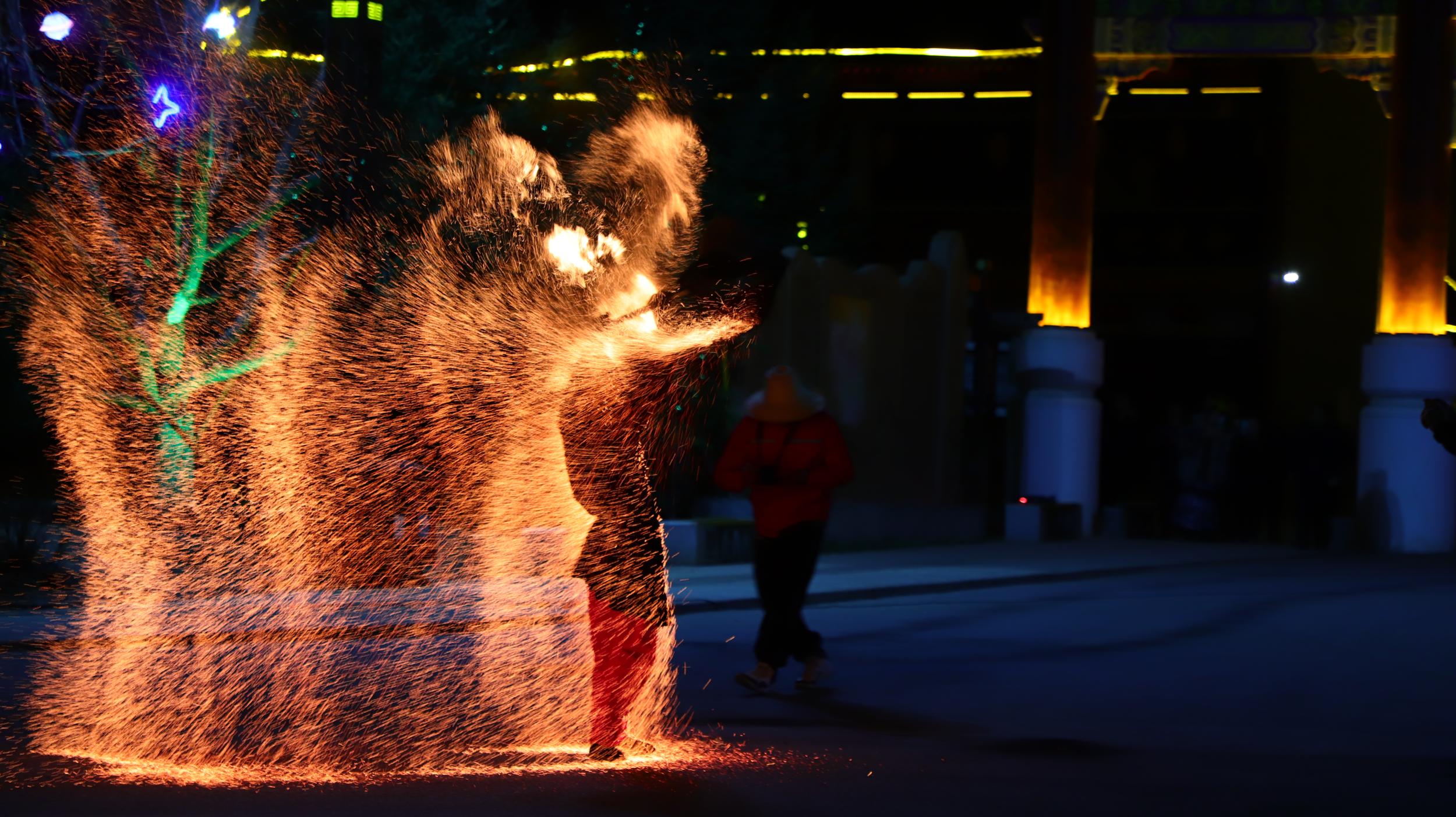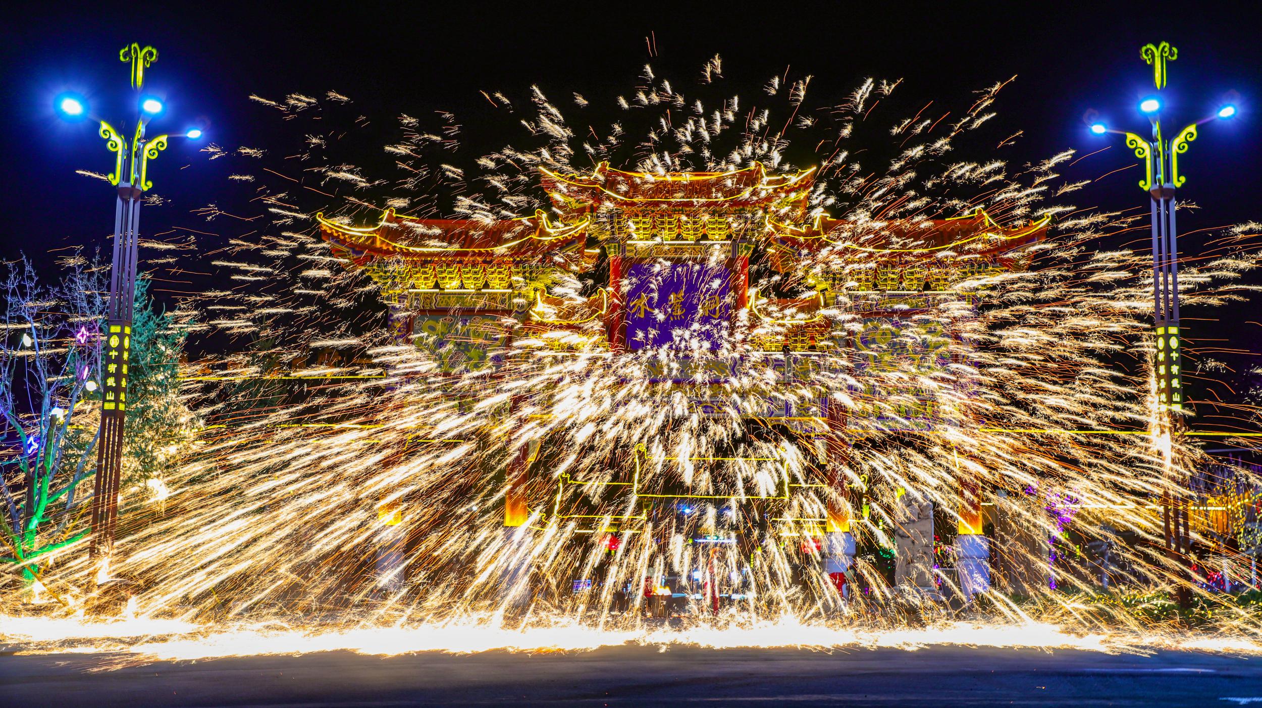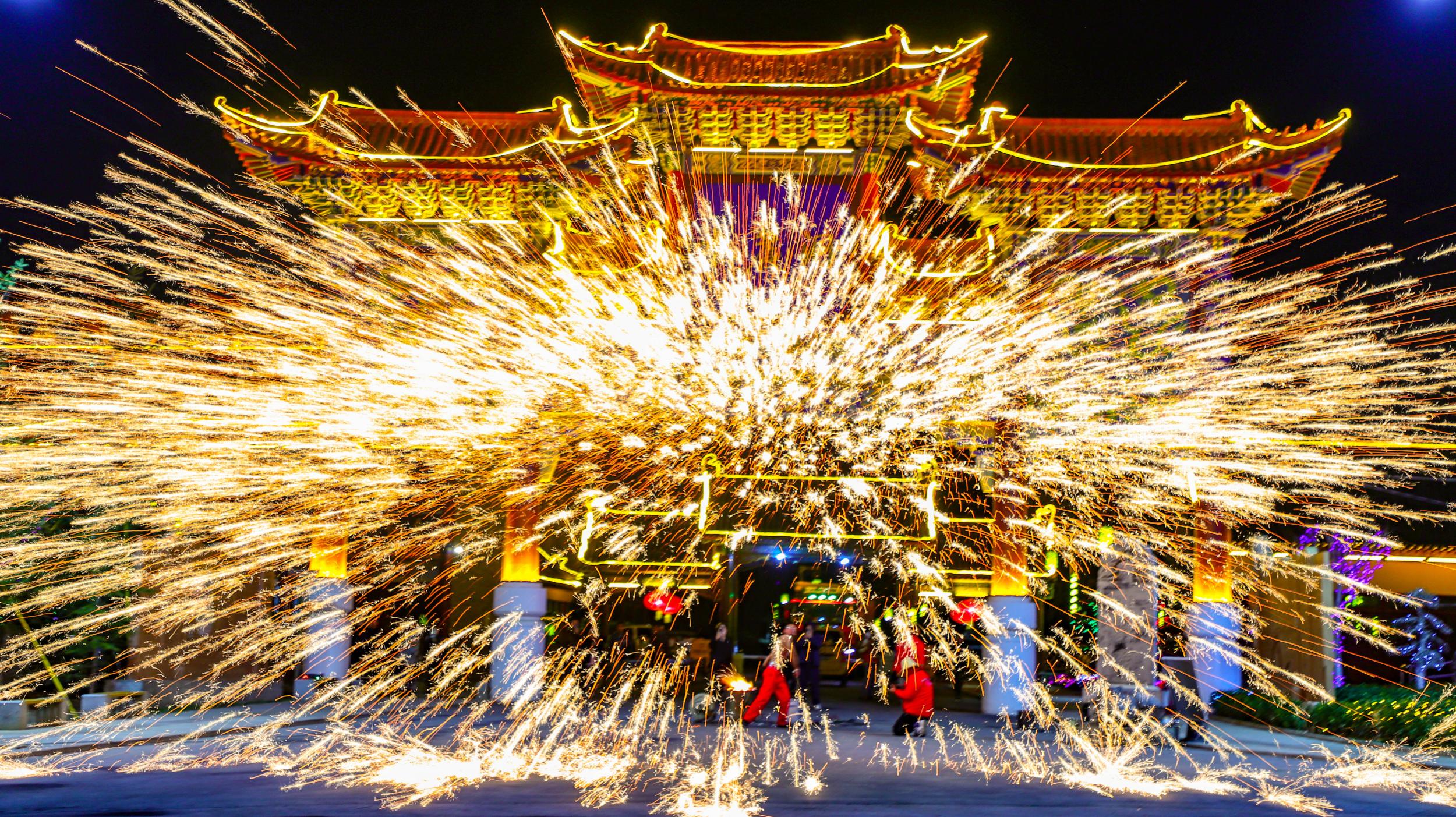 璀璨奪目的鐵花在空中綻放,場(chǎng)面十分壯觀。民眾在火樹銀花、星光璀璨之間感受著濃濃的中國(guó)傳統(tǒng)民俗文化。