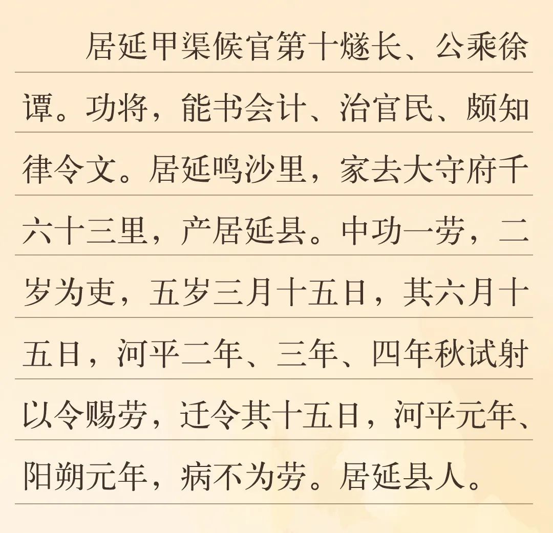 “中功一勞”中的“中功”指得到的功。功、勞、功勞、功績,是漢代計(jì)算政績的名稱與單位,戍卒與官員每日巡視、抵御外敵、參與秋射等,都能積攢“功”、“勞”。簡文中提到了“河平二年、三年、四年秋試射以令賜勞”,“秋試射”即漢代秋季比武活動之一的秋射。秋射成績優(yōu)秀可以賞賜勞績,漢代邊塞地區(qū)出土的簡牘中有大量以秋射獲勞的記錄,“功”與“勞”積攢到一定程度,便可升遷。當(dāng)這位官員所屬的候官發(fā)現(xiàn)空缺,便以功勞案為依據(jù),給出官員任免方案,呈報(bào)都尉府,以進(jìn)行官員的升遷調(diào)動。