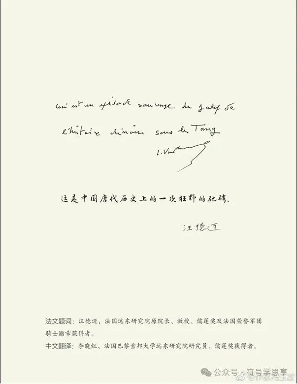 汪德邁先生對(duì)于馮玉雷這部作品給予高度評(píng)價(jià),2018年專門題辭:“這是中國(guó)唐代歷史上的一次狂野的馳騁。”馮教授專門把汪德邁先生給他的法文與中文題辭作為題簽印在書封面上,他多次跟我說:“幸遇汪德邁教授、李曉紅教授,受益良多,感激之情,難以言表。”