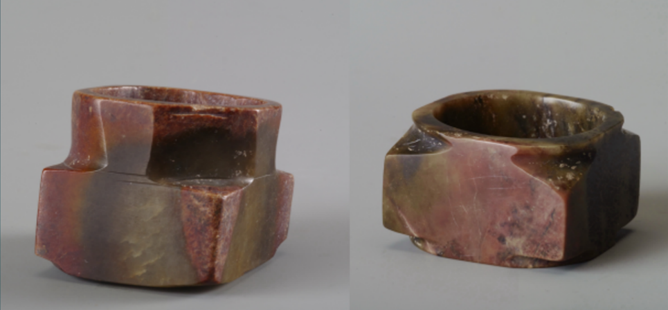 根據(jù)以上兩件玉琮形狀和材質顏色比對,它們原為一件較大的玉琮被切割成兩件。