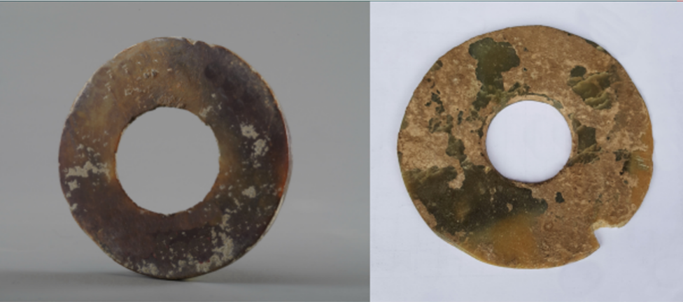 胡家底遺址發(fā)現(xiàn)的三對玉璧和玉琮,每對材質基本相同,玉璧中孔可套疊在琮之射端,可見當年有可能套疊使用以祭祀天地。